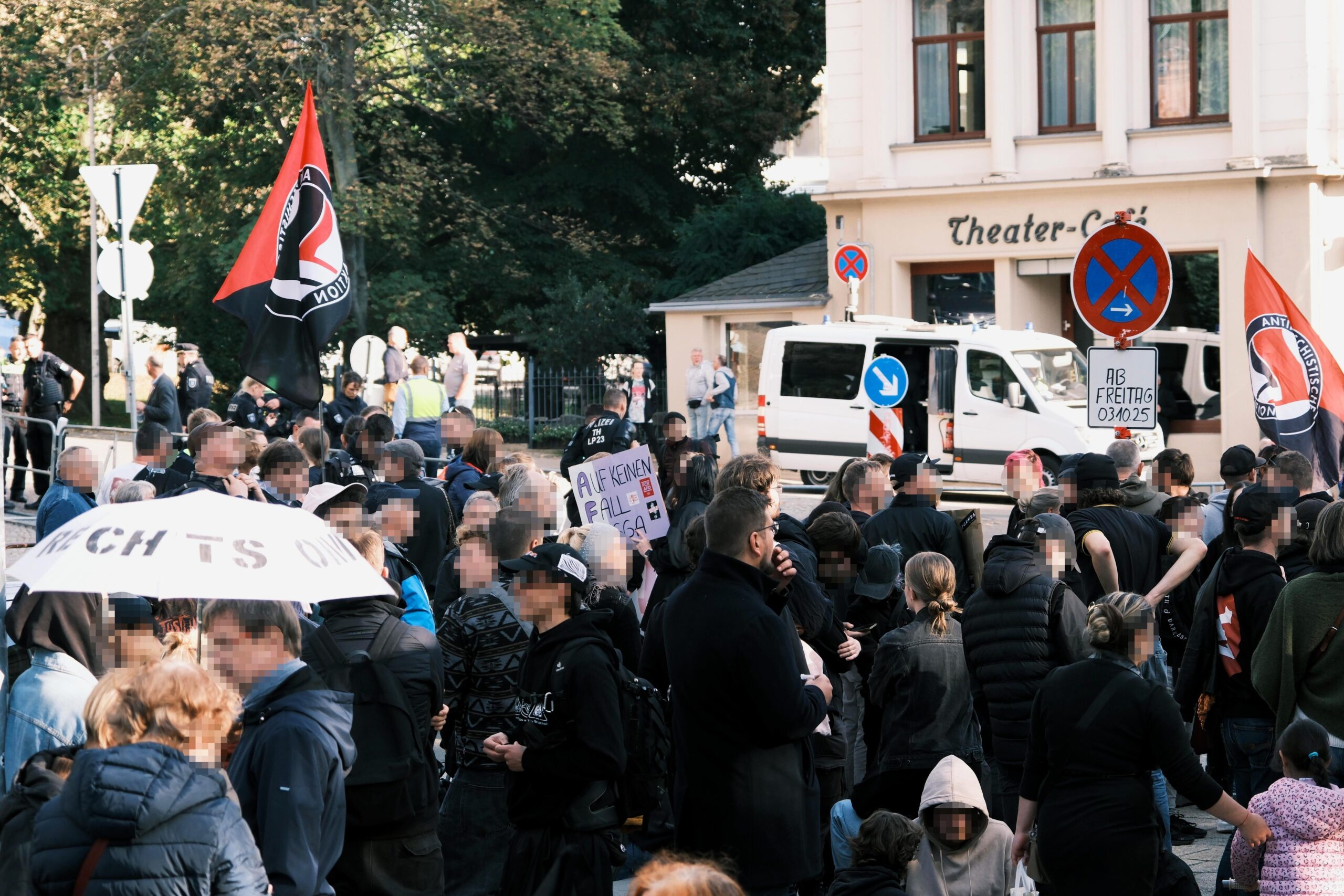 Am Ende waren den Bullen die circa 250-300 Antifaschist*innen am doppelt abgeriegelten Theater dann scheinbar doch lieber als irgendwo am Bahnhof, von dem aus ja auch die Faschos zu ihrer Demo kommen mussten, weshalb die Laufstegdebatten letztlich doch eingestellt wurden und die Demo loslaufen durfte.