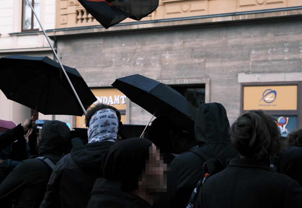 Die Faschos schienen auf Gewalt also zumindest vorbereitet; schon die gesamte Woche über zogen sie in Kleingruppen durch die Stadt und scouteten offenbar. Ihre Demoroute liefen sie dabei gleich mehrfach ab; am 03.10. selbst kam es dann aber zu keinerlei Konfrontationen.